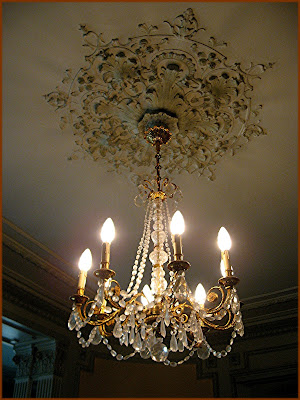 No practical contemporary fluorescent lighting fixtures here ~ gorgeous chandeliers and the loveliest ceiling rose I've ever seen.