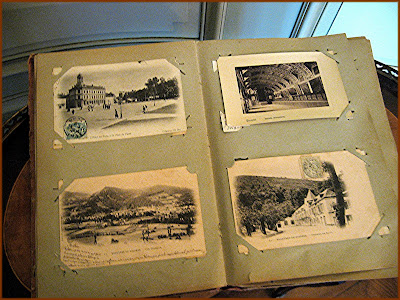 A vintage album open to show old photos of the town.