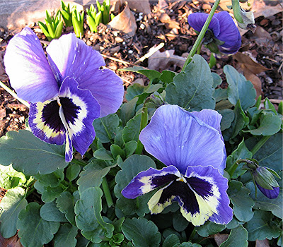 Bluebell bulbs - behind the pansies - are already peeking through.