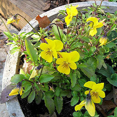 These bright Violas are happy in their large pot and will grow into a huge clump by Spring.