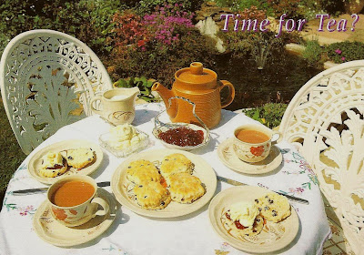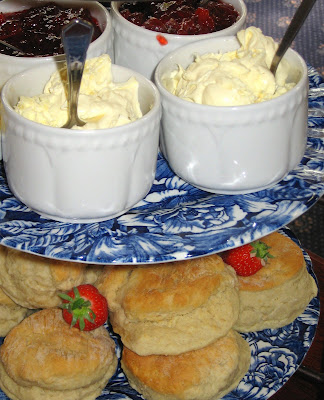 As you drive Devon's countryside, along the narrow lanes and through the villages of thatched cottages, you will see the sign...............Devon Cream Teas. It's sometimes hit or miss and you may not get the perfect one every time, however if it's a farm, a little outdoor tearoom next to a rose covered cottage home, or a commercial venture such as country hotel or restaurant, you will enjoy your afternoon tea I'm certain. Perhaps even more important than the cream is the scone. Usually you are offered a choice, plain or fruit - always make sure they're freshly baked and served barely warm - so the cream doesn't slide off. The jam should be strawberry, thick with fruit, and home-made is always best.