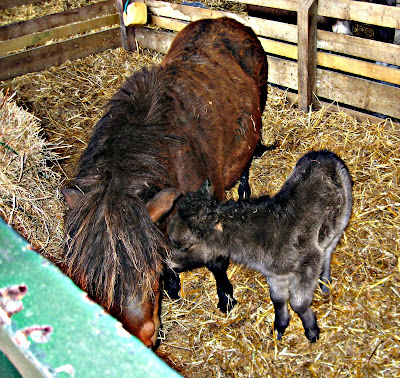 In the 'nursery' several day old foals snuggled close to their mothers.