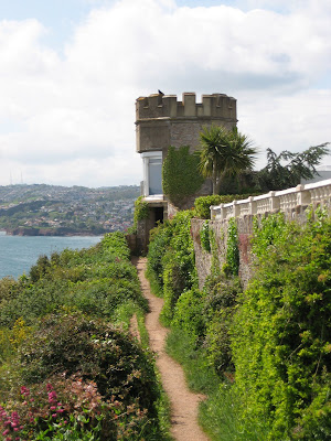Leaving the open headland, the narrow path edges the cliff and is smooth and flat with a few steps carved into the steeper parts. A gentle stroll passes by high walls and pretty gates which lead to large homes. Their beautiful views across the water look toward the seaside town of Paignton, and on to the far end of the bay and the fishing town of Brixham.