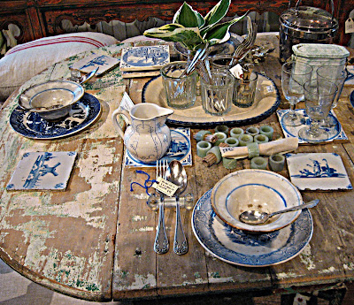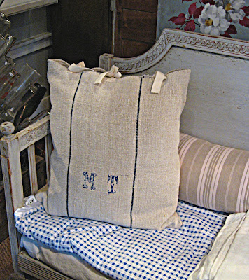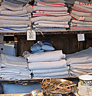 My most exciting find was a huge array of linens. Real French hemp grain sacks, some cut and sewn into pillow covers. Tablecloths woven and monogrammed. Huge heavy linen bed sheets. Embroidered pillow cases. Farmers' shirts and smocks.............
