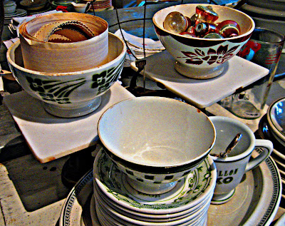 Painted country furniture. Pitchers and pots. Interesting china including lovely white ironstone, and French cafe au lait bowls. Glassware. Old tiles. Platters and plates.