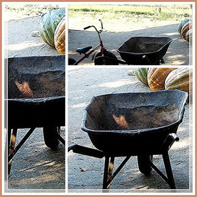 Village wandering one beautiful October day, I noticed this old rusting wheelbarrow. Close by, the biggest pumpkins were waiting patiently for their journey to the kitchen, hopefully to be turned into something delicious, and placed lovingly on the farm table.....that's what French cooks do!