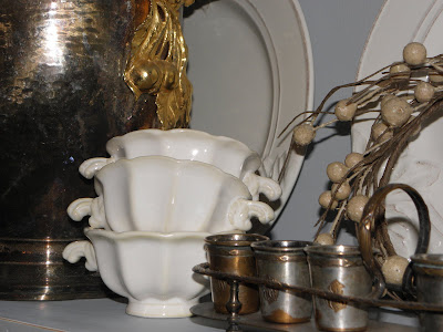 The two small stacks of different shaped handled bowls were from Homegoods. These appealed to me for several reasons ~ they look French, they look old due to the slightly yellowed edges, they are cute shapes, and of course they were very inexpensive, as in cheap!