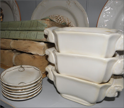 My new stack of tiny butter pats ~ old, slightly worn on some edges, French style decoration in gold, perfect. My friend Vanessa spotted these when we were treasure hunting a couple of weeks ago. She always finds things I love......and doesn't try to sneak off with them to her house! You're the best friend ever Vanessa. The six were just $10.00, a real deal.