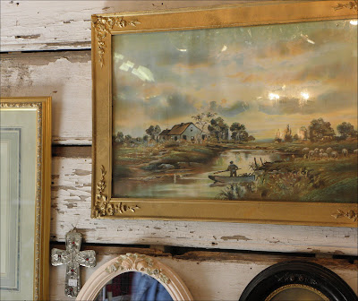 The other 'sheep in English meadows' paintings I showed you recently on SuzAnna's wall, stayed in my mind, and one of you told me I needed to go back and buy one if it reminded me so much of home. Of course the prettiest one had been sold to some lucky person. Always remember, if you see something you love get it before someone else snaps it up!Carolee must have known I was coming................for there, hanging centre stage on her wall was my 'sheep in English meadow' painting, an old starting to crumble in the corner print, in the perfect refurbished old gold French looking frame. I love the sky, the river, the thatched stone farm cottage, the man in his crude little flat-bottomed punt.................and the flock of grazing sheep in the water meadow.