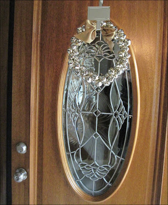 Martha Stewart 'jingle bell wreath' from a few years back, on a silver hanger engraved with our family name - a lovely gift from dear friends.