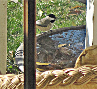 I sat at the computer for a while and, after the sun came up, it wasn't long before several chickadees and a lone titmouse flew onto the frozen fountain in search of a morning drink. Knowing the temps. were stuck below freezing for the coming days and water would remain solid ice, I boiled a tea kettle and poured on the hot water........for at least on hour or so the birds could drink.