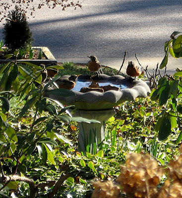 The Robins, chirpy harbingers of Spring, cover the lawn looking left and right, then fly to the bird baths for a refreshing dip - they love to bathe family style.