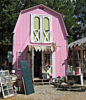 Back at Tracy's Little Shabby Shack, great painted pale pink furniture. Nice dresser with hutch ~ where the rose plates would look divine.......