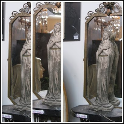 A life size Madonna, French funeral baskets, Gothic window, angel wings = an almost religious experience! Lovely displays.