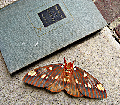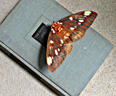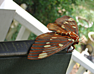 On the front porch floor, a winged beauty unknown to me. Size, very large, the book measures five inches in width. Colors, spectacular, brilliant rust and French blue, my favorites. Stripes and spots so symmetrical - perfection painted on a creature whose life is brief. Another of Nature's masterpieces.