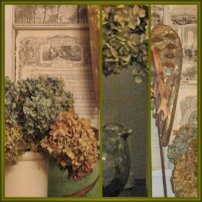 ................those hydrangeas from the garden. Mine are really changing now, colors so different from their brilliant blue of Summer. The change to chartreuse green was lovely, now that shade is becoming deeper, tinged with dusky mauve and cottage pink. I think cutting blooms for drying at different times during Autumn gives a variety of shades when the drying process is complete. Later some tan and cream shades appear as the blooms eventually die on the bush, these can be added to give more definition to large bunches in a container.