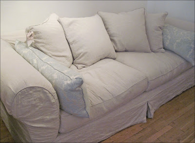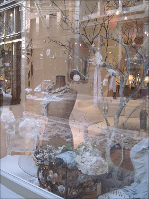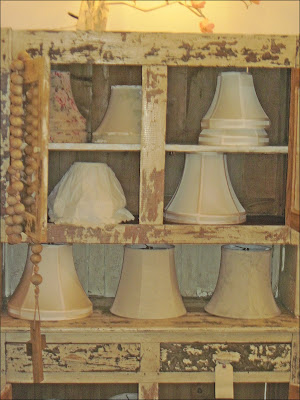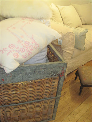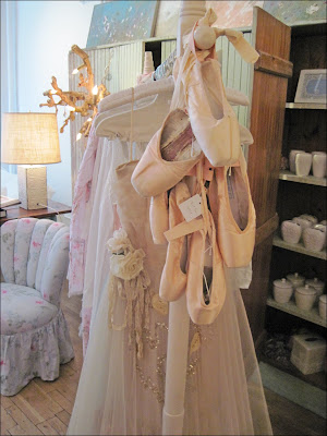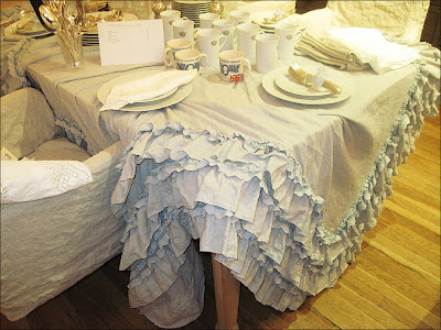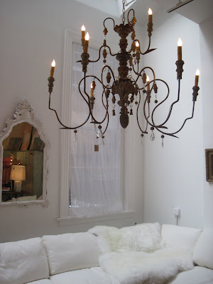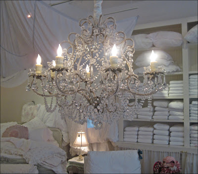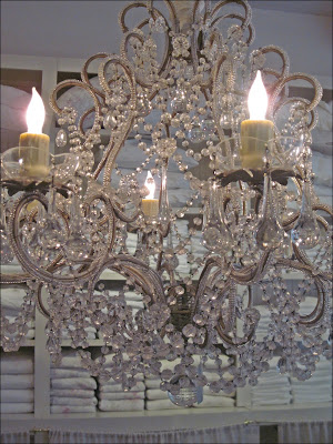 As promised, more from my recent visit to Rachel Ashwell's New York shop Shabby Chic Couture which opened last Fall. On entering, one feels surrounded by a peaceful calm. Most of the furniture, sofas and chairs, are dressed in white or pale natural linen upholstery or slipcovers, illuminated by fabulous overhead chandeliers and wall sconces. While my DH relaxed in a comfy chair, Jasmin and I wandered through the shop and, after getting permission from the very nice staff, took photos of all the beautiful things we would have liked to bring back to North Carolina!