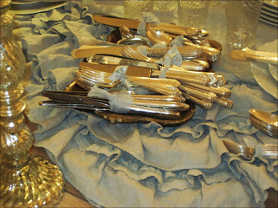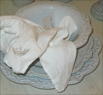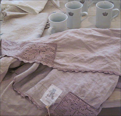 Another exquisite dyed linen cloth ~ besides being used as a table cover I could see it across a pretty bed. Perfect white mugs with crowns.