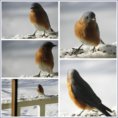 Our snowfall turned to sleet early yesterday morning. The sharp gritty noise it made on the bedroom window woke me just before first light. It continued much of the day making the hoped-for fluffy, sticky stuff, change into blowing drifts and then a hard crust. The landscape was transformed. We were unable to open the back door as the hard snow was piled against it - DH had to go around with his snow shovel (a relic from our Northern years!) and dig us out! The bitter cold will continue for several days. Our birds arrived at dawn. The feeder birds assisted in scattering seed for the ground feeders, all were eating well. It's on days like this DH and I feel money for seed was well spent. The birds are grateful for a meal to keep them warm and their body weight correct enabling them to fly.